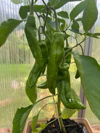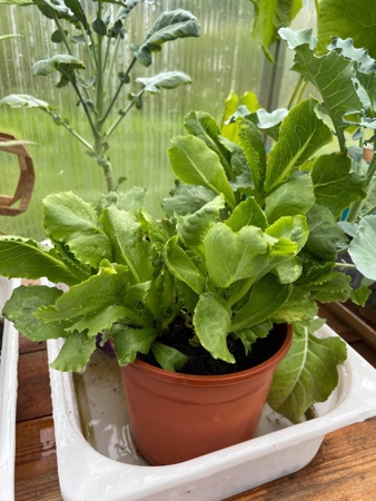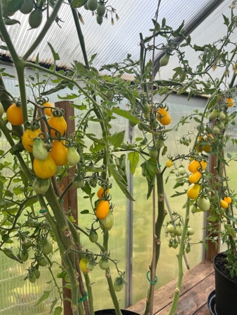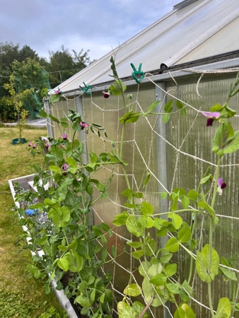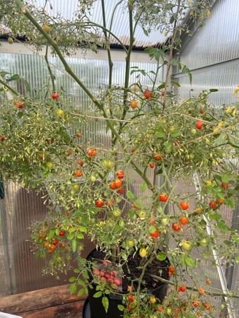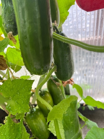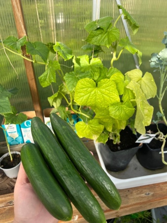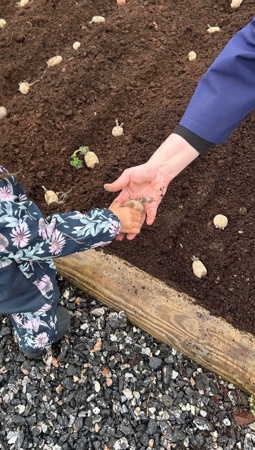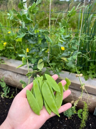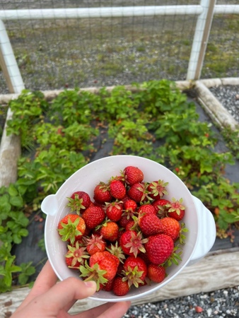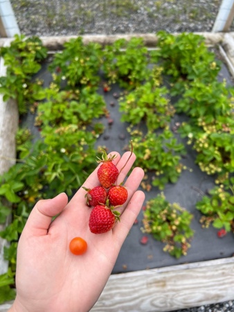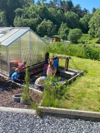 I hagen har vi eple- og plommetrær, solbær, rips, og stikkelsbærbusker. Vi planter grønnsaker som poteter, kålrot og gulrøtter, sukkererter og jordbær. Inne i drivhuset har vi plantet litt forskjellig. I fjor hadde vi mye og fikk gode avlinger. Vi hadde agurk, tomat, paprika, brokkoli, gressløk, salat, reddiker og purreløk.